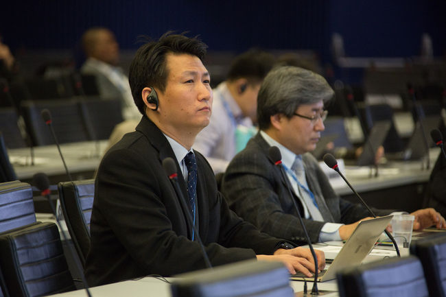 [사진] 16일 스위스 제네바에서 열린 ITU 국제표준화 회의에 참석한 KT 최회림 책임연구원, 정성호 한국외대 교수(왼쪽부터) /KT 제공