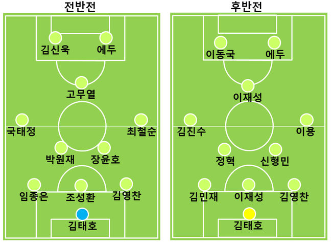 리드를 내준 채로 전반전을 마친 전북은 후반전에 에두와 김영찬, 김태호를 제외한 모든 선수를 교체했다. 이동국이 에두와 최전방에, 2선의 중앙에 이재성이 자리 잡았고, 중원은 정혁과 신형민이 호흡을 맞췄다. 좌우 윙백에는 김진수와 이용이, 수비진은 김민재, 이재성, 김영찬으로 구성됐다.