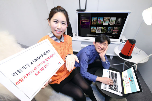 KT는 기가 인터넷-IPTV 서비스 동시가입자에게 3년간 최대 41만 원의 할인 혜택을 제공하는 ‘리얼기가xUHD15 콜라보 프로모션’을 진행한다고 2일 밝혔다.