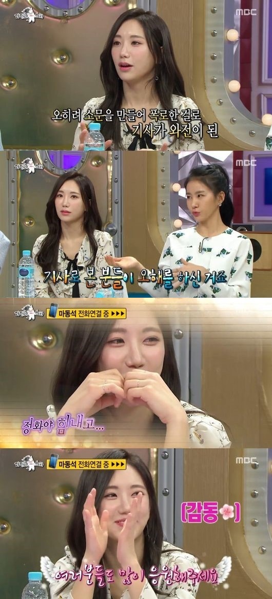 “정화야 힘내고. 여러분들도 많이 응원해주세요”라는 마동석의 진심 어린 응원은 결국 예정화를 눈물 흘리게 했다. 많은 관객과 시청자에 호감을 사고 있는 배우 마동석의 어린 여자친구라는 것도 예정화에게는 감당해야 할 부담이었다. 하지만 이날 ‘라디오스타’를 통해 마동석의 진한 사랑과 응원을 받은 예정화는 스스로도 그 부담감을 내려놓을 수 있게 됐다.