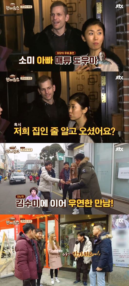 또한 지난 1일 방송에는 걸그룹 아이오아이의 전소미 부모와 이연복 셰프를 우연히 만나 눈길을 끌었다. 이경규, 강호동, 성소와 김종민이 연희동으로 한 끼 얻어먹으러 갔는데 연희동에서 중식당을 운영하는 이연복 셰프가 문고리가 고장나 철물점에 가던 중 ‘한끼줍쇼’ 팀을 만났다.