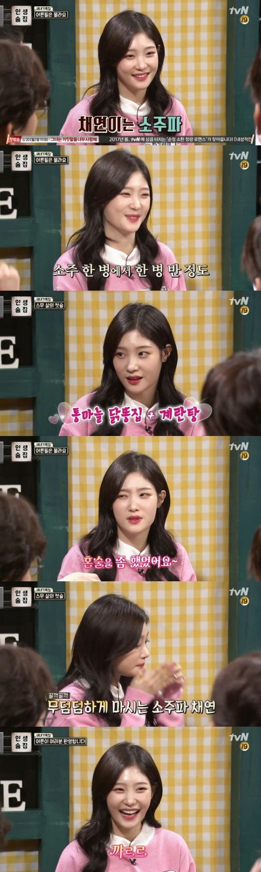 정채연은 다이아 멤버들 중에서는 술을 좋아하는 사람이 없었고, 술에 대한 호기심에 홀로 술잔을 기울였다며 혼술을 시작한 이유를 전했다. 심지어 광고 촬영 전날에는 소주 반병을 먹고 자면 다음 날 붓기가 싹 빠진다고 말해 함께 출연한 걸그룹 멤버들과 서신애의 귀를 쫑긋하게 했다. 올해 21살로 음주를 즐기게 된지는 갓 2년차가 됐지만 이미 술에 대한 철학이 있어 보였다.