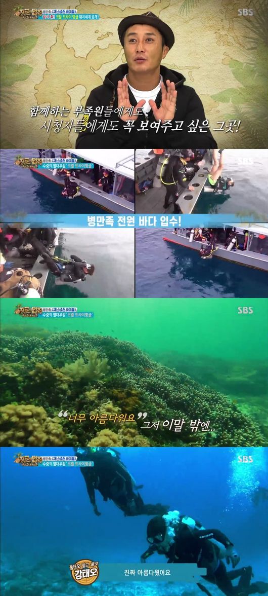 생존을 마친 병만족은 수중의 열대우림으로 유명한 코타마나도 해저 탐험에나섰다. '정글' 최초로 멤버 전원이 스쿠버다이빙에 도전했다. 강태오는 "너무 아름다웠다"고 소감을 전했다. 김민석은 "끝은 정말 행복하게 끝나는구나"라며 "피로가 사라지는 기분이었다"고 놀라움을 표현했다. /pps2014@osen.co.kr