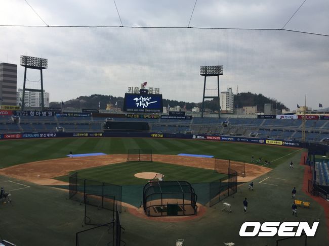 한껏 찌푸린 날시에 부슬부슬 봄 비가 내렸던 창원 마산구장. 개막전 준비에는 이상 없다.