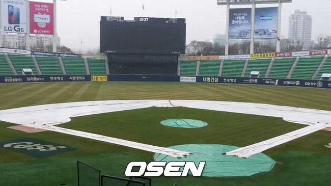 5일 오후 3시30분 현재 잠실구장에서 비가 내리고 있다. 마운드와 그라운드 내야 흙 부분에는 방수포가 덮혀져 있다. LG 선수들은 실내 연습장에서 간단하게 훈련을 했다. 이날 오전부터 비가 내렸고, 오후 들어서는 빗줄기도 굵다.
