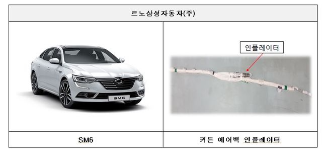 르노 삼성 SM6는 커튼에어백 인플레이터의 제조불량으로 충돌 시 커튼에어백이 작동하지 않을 가능성이 발견됐다. 리콜대상은 2016년 9월 20일부터 2016년 9월 30일, 10월20일부터 11월 2일까지 제작된 SM6(가솔린, 가솔린터보, LPG, 디젤 사양) 승용자동차 4,300대이며, 해당 자동차 소유자는 2017년 4월 12일부터 르노삼성자동차(주) 서비스센터에서 무상으로 수리(해당 부품 교체)를 받을 수 있다.