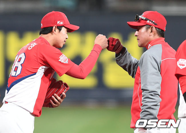 결국 임기영은 자신이 원하는대로 경기를 완봉으로 마무리했다. 이대진 투수 코치가 마운드를 올라온 틈에 숨을 고른 임기영은 단 4개의 공으로 마지막 타자 박경수를 삼진으로 처리하며 어느 때보다 행복하게 경기를 마쳤다. /sportsher@osen.co.kr