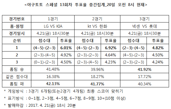 체육진흥투표권 스포츠토토의 수탁사업자인 ㈜케이토토(대표 손준철)는 오는 21일(금)에 열리는 2017시즌 한국프로야구(KBO) 3경기를 대상으로 한 야구토토 스페셜 13회차 투표율을 중간 집계한 결과, 1경기 LG-KIA전에서 홈팀 LG(41.48%)와 원정팀 KIA(42.13%)의 투표율이 거의 비슷하게 나와 치열한 접전을 예고하는 것으로 집계됐다고 밝혔다.