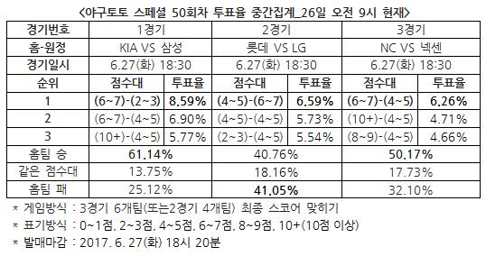 KBO 3경기 대상 야구토토 스페셜 50회차 투표율 중간집계