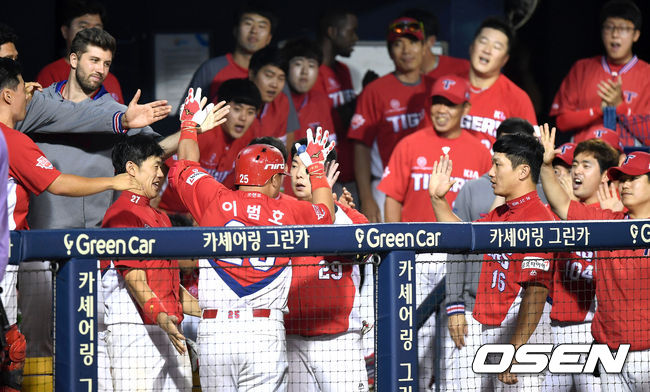KIA의 방망이는 이번주 내내 뜨거웠다. KIA는 지난 주말 2위였던 NC와 3연전을 모두 패하며 공동 1위까지 허용했다. 그러나 주중 삼성전을 싹쓸이하며 다시 단독 선두로 올라섰다. 비결은 타격이었다. KIA는 세 경기서 46득점을 쓸어담으며 삼성 마운드를 폭격했다. 30일 잠실 LG전에 앞서 취재진과 만난 김기태 감독은 "상대에 대한 예의가 아니다"라며 삼성 3연전 언급을 자제했으나 "타선의 집중력을 칭찬한다"라고 덧붙였다. 세 경기 연속 두 자릿수 득점. 파괴력은 엄청났다.