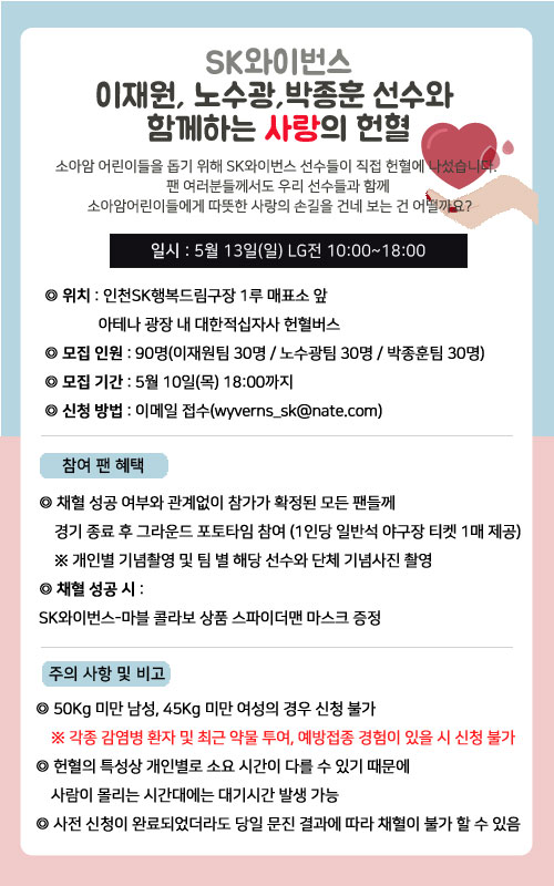 SK 와이번스는 선수와 팬이 함께 어우러져 선행에 나선다는 의미를 담아 헌혈에 동참할 팬들을 모집한다. 모집인원은 총 90명(이재원팀 30명 / 노수광팀 30명 / 박종훈팀 30명)이다. 헌혈은 13일 오전 10시부터 인천SK행복드림구장 1루 매표소 앞 아테나 광장 내에 배치된 2대의 대한적십자사 헌혈버스에서 진행될 예정이며 세 선수는 경기가 끝난 후 헌혈에 참여한다.