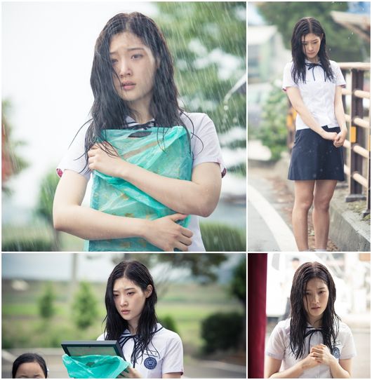 무엇보다 정채연이 빗 속 투혼을 불사한 채 여고생 정정원 역으로 열연한 첫 촬영 현장이 포착돼 눈길을 사로잡고 있다. 교복을 입은 여고생의 모습을 한 정채연이 쏟아지는 물줄기 속에서 액자를 꼭 끌어안은 채 슬픔에 잠겨있는 장면. 이어 정채연은 그리움 가득한 눈빛으로 액자 속 사진을 쳐다보는가 하면, 물에 빠진 생쥐처럼 촉촉이 젖은 머리를 한 채 두 손을 가득 모으고 어딘가를 응시하는 모습 등을 담아냈다. 이와 관련 정채연이 슬픔에 잠겨있는 이유는 무엇일지, 끌어안은 액자의 주인공은 누구일지 궁금증이 모아지고 있다.