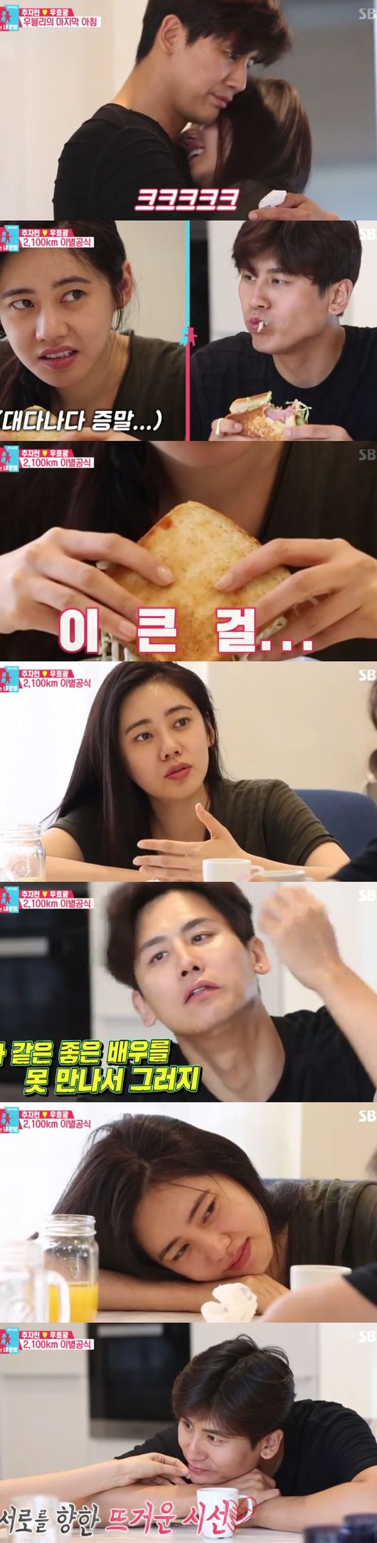 식사를 마친 추자현은 남편과 떨어져 있을 시간을 생각하며 걱정했다. 추자현은 "나는 연예인하고 결혼할 생각이 없었다"고, 이에 우효광은 "나 같은 좋은 배우를 못 만나서 그렇다"고 말해 슬픈 분위기 속 농담을 터트렸다.