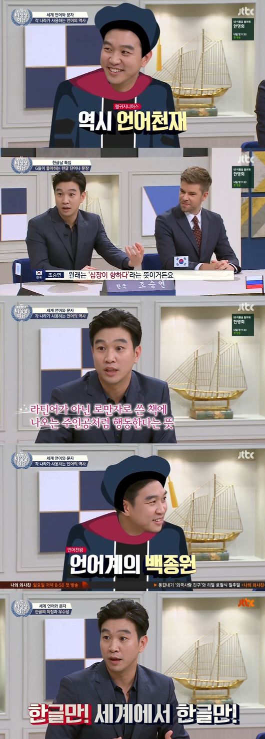 벌써 ‘비정상회담’에 세 번째 출연인 조승연 작가는 한글날 특집에 딱 맞는 게스트였다. ‘언어천재’라는 수식어답게 조승연은 박학다식함을 뽐내며 각 언어에 대한 흥미로운 이야기들을 전했다.