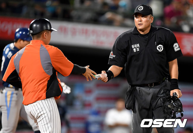 1차전 10회까지 팽팽했던 경기는 11회초가 끝난 후 9-2로 일방적인 스코어가 됐다. 3-2로 균형이 깨지고, 2사 만루에서 나성범의 밀어내기 볼넷 때 포수 강민호가 공을 잡지 못하고 뒤로 빠뜨렸다. 주자 2명이 홈을 밟아 5-2로 벌어졌다. 볼넷으로 다시 2사 만루가 됐고, 모창민 타석에서 돌발 상황이 생겼다.