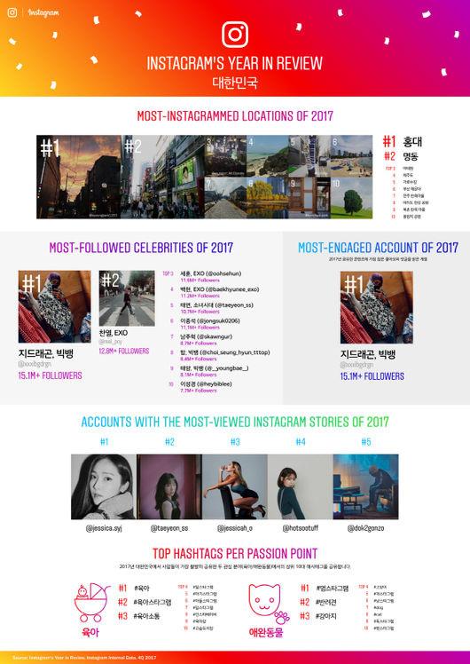 Top 5 계정에는 지드래곤과 함께 EXO 멤버 박찬열(@real__pcy), 오세훈(@oohsehun), 백현(@baekhunee_exo), 소녀시대 태연(@taeyeon_ss)이 함께 이름을 올려 케이팝 스타들의 강세가 올해에도 두드러졌다. EXO 박찬열은 2017년 가장 많은 ‘좋아요’를 받은 사진과 동영상의 주인공이기도 하다. 무려 150만 개가 넘는 ‘좋아요’를 받았다.