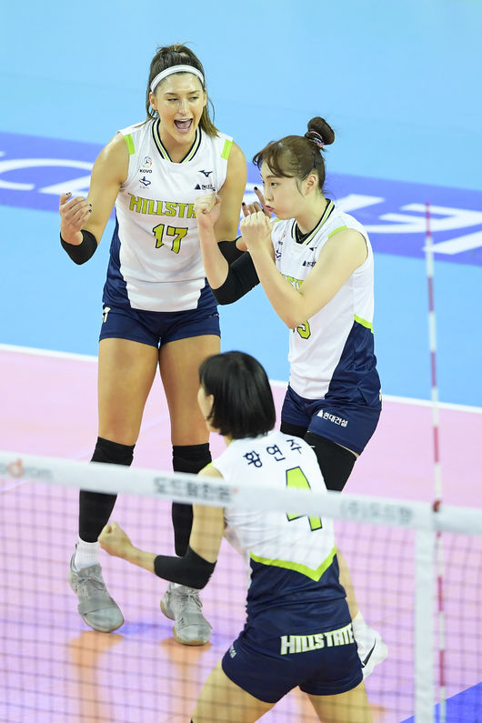 현대건설은 27일 김천실내체육관에서 열린 ‘2017-2018 도드람 V-리그’ 여자부 4라운드 한국도로공사와의 경기에서 세트 스코어 3-1(25-23, 25-14, 23-25, 25-15)로 완승을 거뒀다.