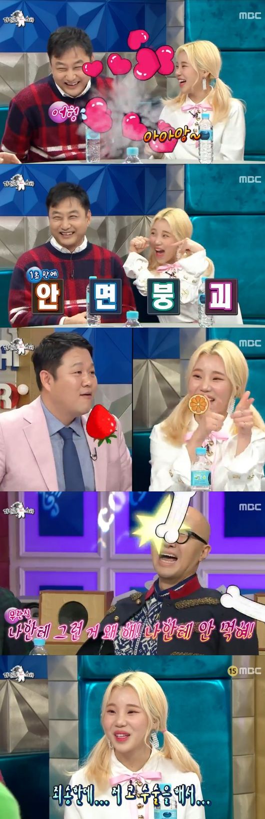 모모랜드 주이가 예능감을 폭발시키며 '라디오스타' MC들을 들었다 놨다 했다. 등장부터 하트를 날리며 김국진에게 기절 연기를 시킨 주이. 코 성형 사실을 당당히 밝히는가 하면, 아픔을 개그로 승화시켜 홍석천을 놀라게 만들었다. 새로운 스타 탄생을 알리는 순간이었다.