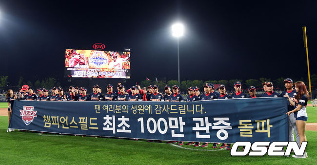 KIA는 관중에서도 기념비를 세웠다. 창단 이후 최초로 100만 관중을 돌파한 것이다. 개막 초반부터 선두를 유지한데다 드라마틱한 승리가 잦아지자 구름관중이 몰려들었다. 8월의 한 여름 찜통 더위인데도 만원 관중이 찾아왔다. 모두 10번이나 만원관중을 기록했고 9월 23일 kt전에서 100만 관중을 돌파하는데 성공했다. 챔피언스필드 건립으로 관람환경이 획기적으로 좋아졌고 우수한 경기력에 팬들에게 한걸음 더 다가서는 마케팅도 한몫을 했다. 김기태 감독은 "팬들의 열성적인 응원이 아니었다면 우승하기 힘들었다"고 고마움을 표시했다.