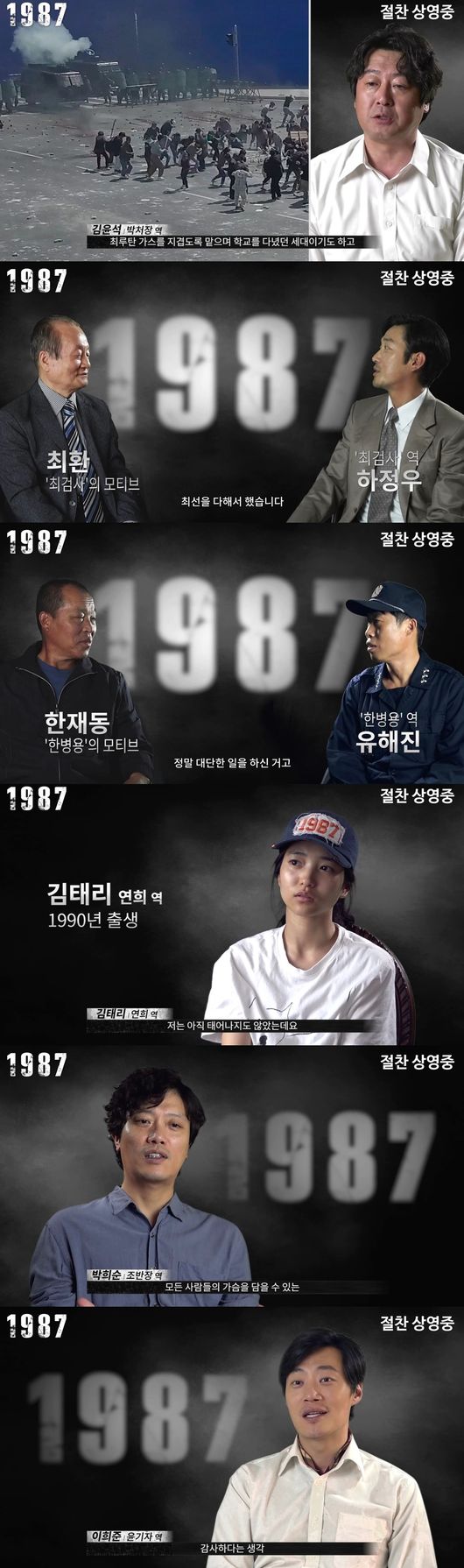 28일 공개된 영상에는 박종철 군의 시신 화장 동의를 거부하고 부검을 밀어붙여 모든 사건의 물꼬를 튼 서울지검 최검사(하정우 분) 역의 모티브가 된 최환, 사건의 진실을 담은 옥중서신을 전달하는 교도관 한병용(유해진 분)의 모티브인 한재동, 사건 축소 사실을 담은 옥중 서신을 내보내는 재야 인사 이부영(김의성 분) 역의 이부영, 故박종철 열사의 친형인 박종부까지. 1987년 상황과 당시의 헌법 내용에 상세한 설명은 물론 열연을 펼친 배우들에 대한 격려의 말이 담겼다.
