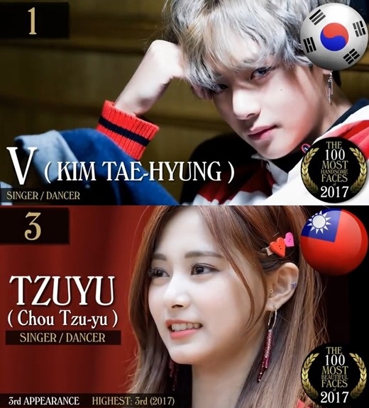 방탄소년단 뷔가 세계에서 가장 잘생긴 얼굴 1위를 차지했다. 트와이스 쯔위는 아름다운 얼굴 부문 전체 3위를 차지했다.