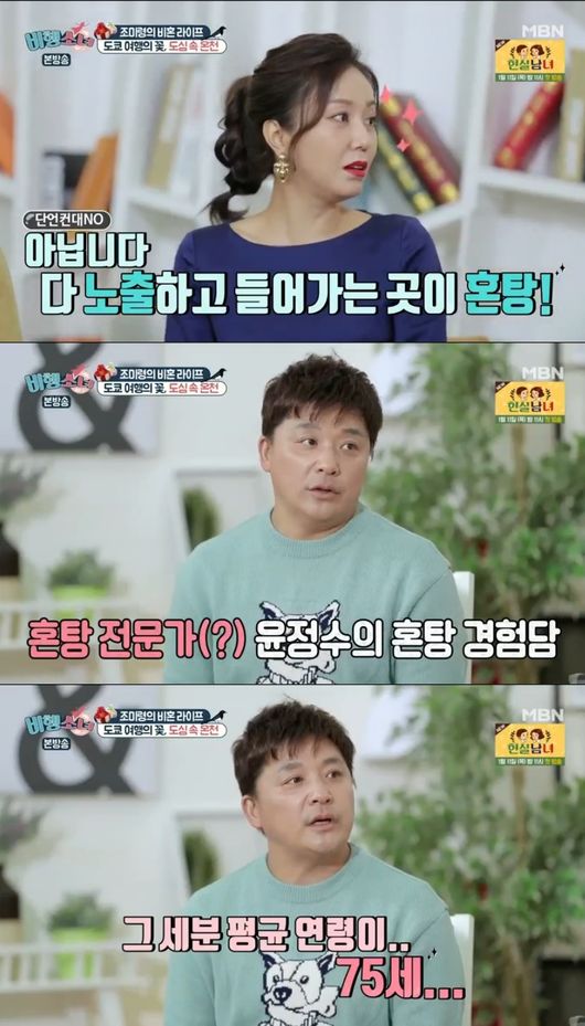 윤정수는 "혼탕에 가봤다. 여자분 세분이 있었는데 거의 벗고 계셨다. 70대 노인분들이셨다"고 말했다.