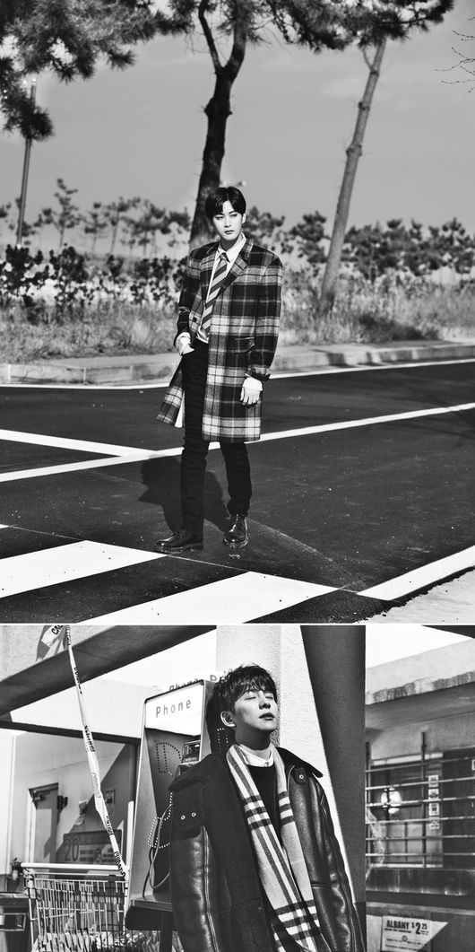 공개된 사진 속 재효는 롱 체크 코트를 입고 우월한 프로포션을 자랑하며 도로를 거닐고 있다.