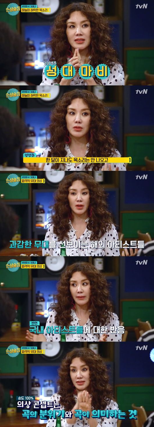 지난 4일 방송된 tvN ‘인생술집’에서 엄정화가 작곡가 김이나와 함께 출연해 그간의 얘기를 털어놓았다. 엄정화는 갑상선암으로 힘든 시간을 보냈다. 연예인에게는 치명적인 일이었다.