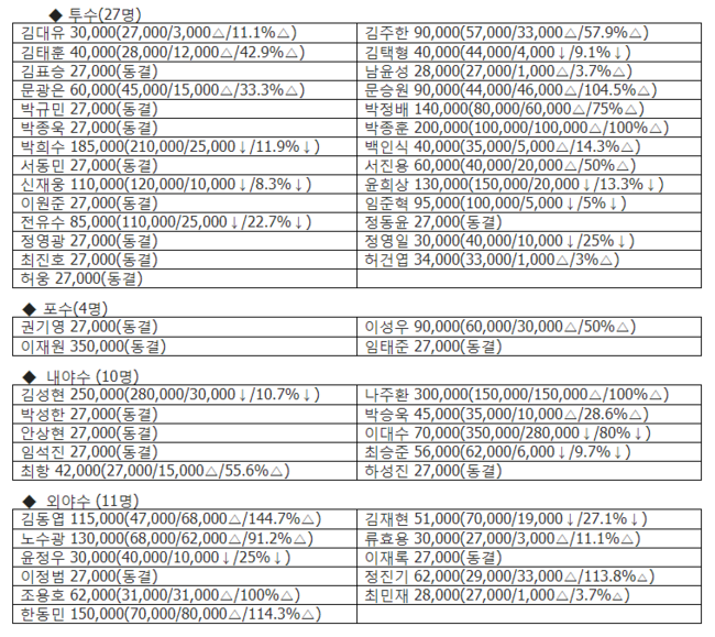 이 밖에도 불펜에서 든든한 버팀목 역할을 해준 박정배(1억 4천만원, 75% 인상), 트레이드로 SK에 합류하여 1번타자로 제 몫을 해준 노수광(1억 3천만원, 91.2% 인상)의 연봉도 올랐다.