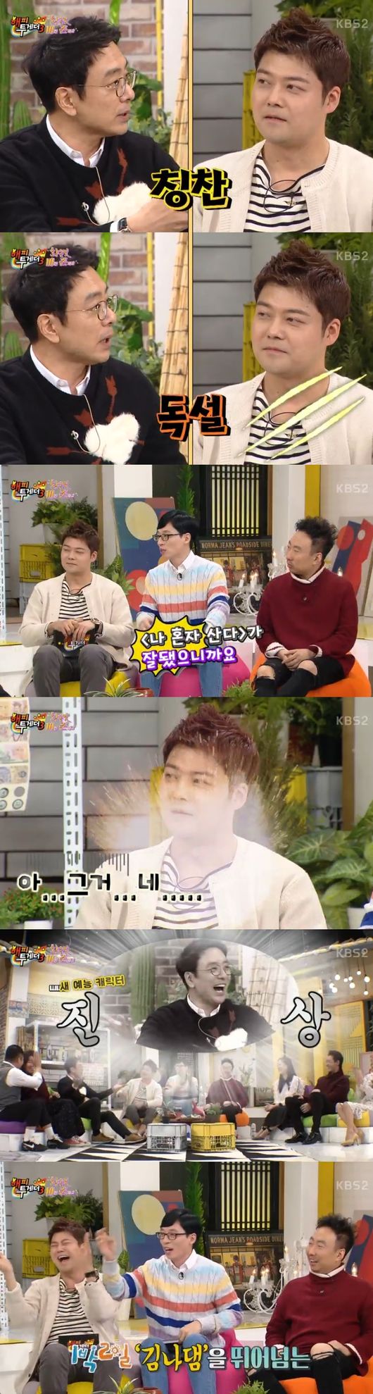 1일 방송된 KBS '해피투게더3'에는 김승우, 고수희, 이태성, 정소영이 출연해 입담을 뽐냈다. 김승우는 인사를 하며 전현무의 대상을 축하했다. 하지만 그는 "작가들과 통화하면서 알았다. 왜 받았냐"고 돌직구를 던졌다.