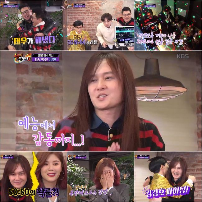 목요일 밤의 터줏대감 KBS 2TV ′해피투게더3′(이하 ‘해투3’)의 1일 방송은 김승우-고수희-정소영-이태성이 출연한 ‘해투동-황금빛 미친 존재감 특집’과 김경호-김태우-이석훈-린이 출연한 ‘전설의 조동아리-내 노래를 불러줘:엔딩가수 특집 2탄’으로 꾸며졌다. 특히 ‘내 노래를 불러줘’에서는 김경호-김태우-이석훈-린이 본격적인 퇴근 대결의 시작과 함께 왕중왕전이라는 별칭다운 진풍경들을 연출해 시선을 사로잡았다.