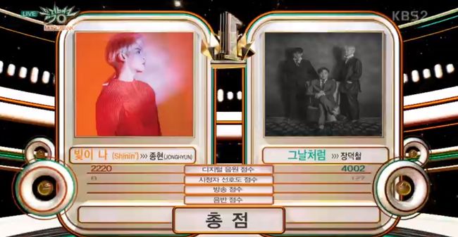 2일 방송된 KBS2 '뮤직뱅크'에서는 고 종현의 '빛이나'가 장덕철의 '그날처럼'를 제치고 1위를 거머쥐어 감동을 안겼다.
