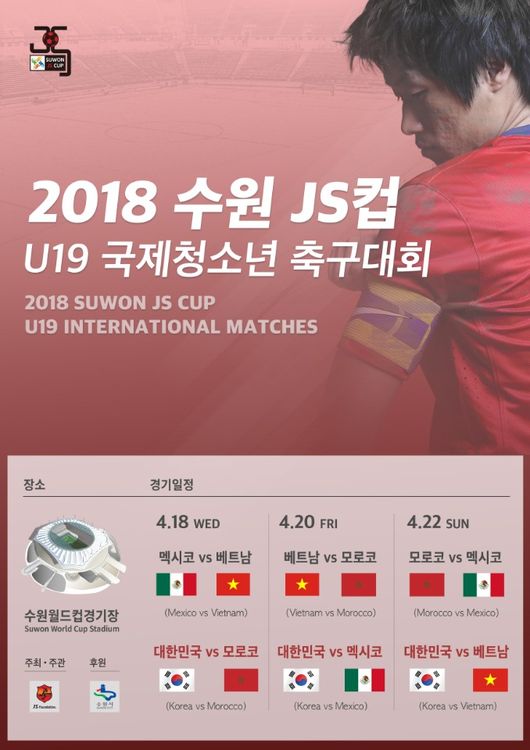 JS 파운데이션(이사장 박지성)이 주최, 주관하고 경기도 수원시가 후원하는 19세 이하(U-19) ‘2018 수원JS컵’이 오는 4월 18일부터 4월22일까지 닷새 동안 수원월드컵경기장에서 개최된다고 27일 밝혔다.