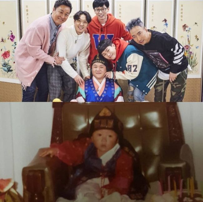 공개된 사진 속에서 조세호는 돌 의상을 입고 유재석, 박명수, 하하, 양세형, 정준하 등 '무한도전' 멤버들과 다정하게 포즈를 취하고 있는 모습. 또다른 사진 속에서는 귀여운 돌 시절의 조세호의 깜찍한 모습이 시선을 사로잡는다.