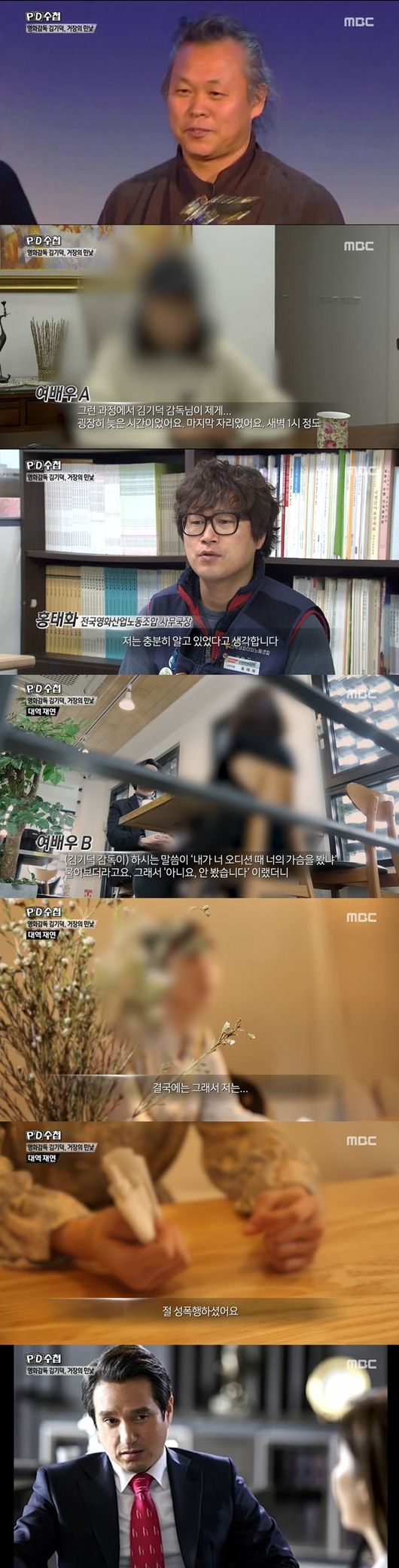 6일 오후 방송된 MBC 'PD수첩'에서는 '영화감독 김기덕, 거장의 민낯'이 공개됐다. 김기덕 감독과 함께 영화 작업을 했던 여배우들의 폭로가 이어졌다. 특히 김기덕 감독에게 성폭행을 당했다는 폭로가 이어져 충격을 줬다. 더불어 배우 조재현도 성폭행에 가담했다고 주장했다.