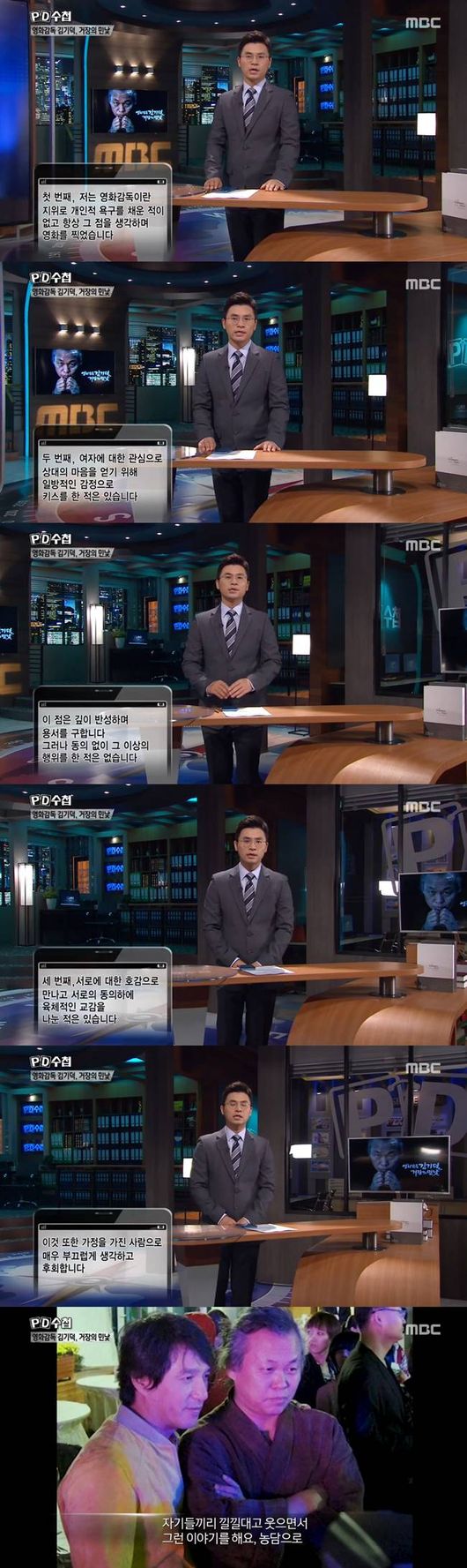 이에 대해 김기덕 감독은 'PD수첩' 측에 문자메시지로 입장을 전한 것으로 알려졌다. 'PD수첩' 측은 김기덕 감독이 보낸 문자메시지를 공개했다. 김기덕 아래와 같이 자신의 입장을 알렸다.