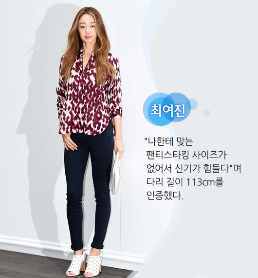 최여진은 모델 출신 다운 롱다리 연기자다. 기본적인 키도 크지만, 그만큼 다리 길이도 길다. 그는 과거 '서인영의 스타뷰티쇼' 방송에서 "나한테 맞는 팬티스타킹 사이즈가 없어서 신기가 힘들다"며 다리 길이 113cm를 인증했다. 주변에서 "타고난 몸매"라고 하자 최여진은 손사래를 치며 "미친 관리만이 살길"이라고 답했다.