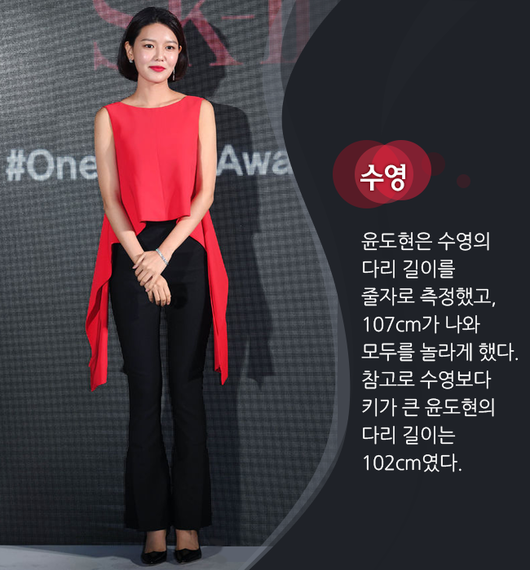 걸그룹 소녀시대에서도 롱다리를 자랑한 수영은 다리 길이가 워낙 길어서 보폭부터 눈에 띈다. 과거 SBS '한밤의 TV연예'에서 다리 길이를 공개해 관심을 받았다. MC 윤도현은 수영의 다리 길이를 줄자로 측정했고, 107cm가 나와 모두를 놀라게 했다. 참고로 수영보다 키가 큰 윤도현의 다리 길이는 102cm였다. 이에 윤도현은 "다리가 참 길다"며 감탄했다.