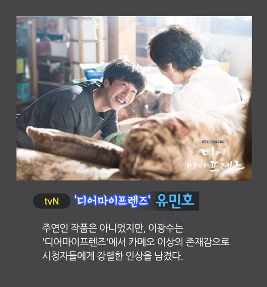 극 중 조희자(김혜자 분)의 아들 유민호 역을 맡은 그는 엄마가 이성재(주현 분)와 황혼 로맨스 분위기를 풍기자 이를 견제해 웃음을 안기는가 하면, 엄마의 치매 소식에 오열하는 모습으로 눈물샘을 자극했다. 비록 그가 주연인 작품은 아니었지만, 이광수는 '디어마이프렌즈'에서 카메오 이상의 존재감으로 시청자들에게 강렬한 인상을 남겼다.