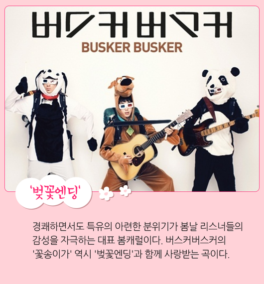 버스커버스커의 '벚꽃엔딩'은 봄을 대표하는 노래다. 발표 이후 매년 봄 차트 상위권에 오를 정도로 꾸준히 사랑받고 있다. 오죽하면 '벚꽃 연금'이라는 말이 탄생했을 정도. 경쾌하면서도 특유의 아련한 분위기가 봄날 리스너들의 감성을 자극하는 대표 봄캐럴이다. 버스커버스커의 '꽃송이가' 역시 '벚꽃엔딩'과 함께 사랑받는 곡이다.