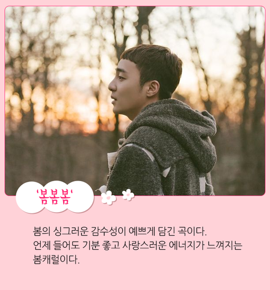 가수 로이킴의 '봄봄봄' 역시 '벚꽃 엔딩'과 함께 봄에 유독 사랑받는 곡이다. 발표 당치 음원차트 올킬을 기록하며 사랑받은 곡인데, 봄의 싱그러운 감수성이 예쁘게 담긴 곡이다. 언제 들어도 기분 좋고 사랑스러운 에너지가 느껴지는 봄캐럴이다.