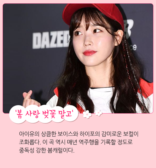 '벚꽃엔딩' 만큼 꾸준히 사랑받는 곡이 하이포와 아이유의 '봄 사랑 벚꽃 말고'다. 이 곡은 아이유가 참여했다는 것만으로도 화제를 모은 곡인데, 아이유의 상큼한 보이스와 하이포의 감미로운 보컬이 조화롭다. 이 곡 역시 매년 역주행을 기록할 정도로 중독성 강한 봄캐럴이다.