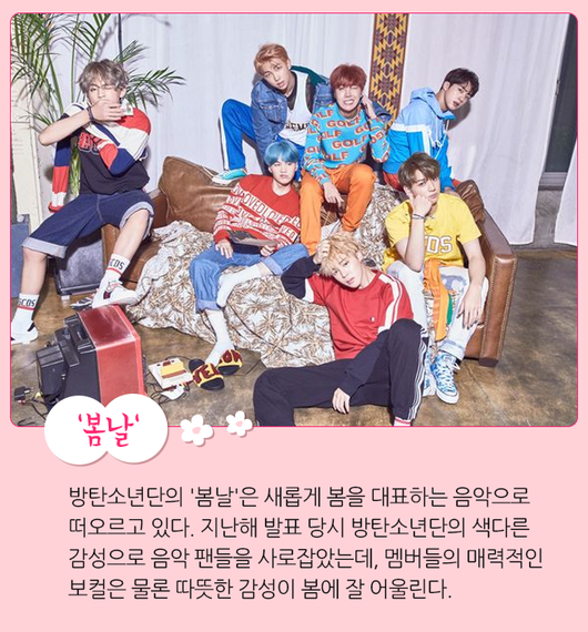 방탄소년단의 '봄날'은 새롭게 봄을 대표하는 음악으로 떠오르고 있다. 지난해 발표 당시 방탄소년단의 색다른 감성으로 음악 팬들을 사로잡았는데, 멤버들의 매력적인 보컬은 물론 따뜻한 감성이 봄에 잘 어울린다.