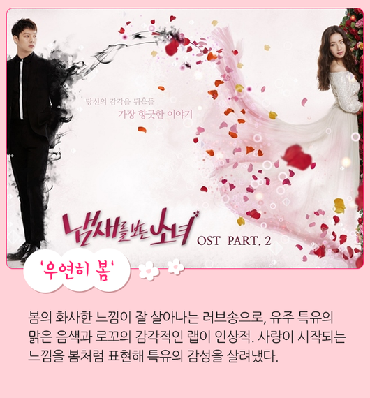SBS 드라마 '냄새를 보는 소녀' OST로 삽입됐던 여자친구 유주와 로꼬의 '우연히 봄'은 은근한 중독성을 가진 봄캐럴로 꼽히고 있다. 봄의 화사한 느낌이 잘 살아나는 러브송으로, 유주 특유의 맑은 음색과 로꼬의 감각적인 랩이 인상적. 사랑이 시작되는 느낌을 봄처럼 표현해 특유의 감성을 살려냈다. /seon@osen.co.kr