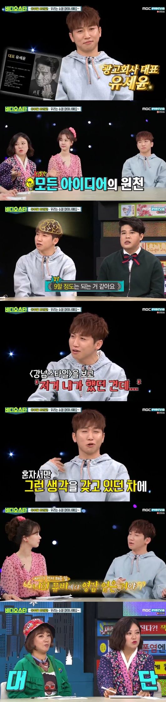 유세윤이 '비디오 스타'에 출연해 개인기 뿐 아니라 입담을 폭발시키며 즐거움을 안겼다. 광고 회사 대표인 그는 아이디어의 9할이 자신의 머리에서 나온다고 밝혔고, 그의 뮤직비디오를 보고 싸이가 영감을 받았다는 사실도 밝혔다.