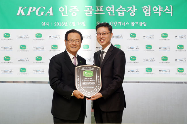 KPGA는 지난 16일, 경기 안양시에 위치한 안양위너스 골프클럽(대표이사 김홍수)과 ‘골프연습장 인증 사업’에 대한 업무 협약을 맺고 ‘KPGA 공식 인증패’를 전달했다.