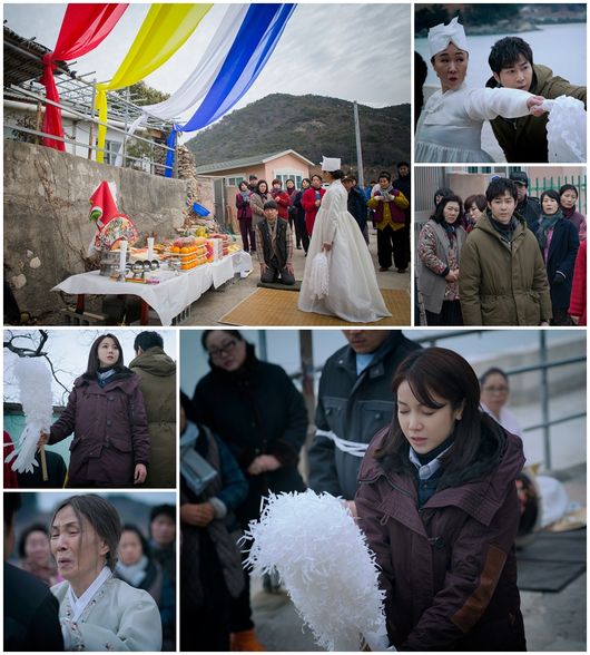 특히 해당 장면에서 시시때때로 튀어나온 전문 용어들이 시청자들의 호기심을 이끌어내며 디테일한 대본에 관한 호평과 함께 굿판 대사들에 대한 해석 요청이 끊이질 않고 있는 터. 먼저 죽은 치매 할머니를 위해 동네 사람들이 마련한 ‘초혼굿’은 ‘죽은 사람의 혼을 소리쳐 부르는 의식’이다. 극중에서는 시골 민박집 마당에 소박한 굿상이 차려져 있는 가운데, 하얀 소복 차림의 무당이 전라도 굿 음악에서 쓰이는 장단인 ‘흘림장단’ 소리에 맞춰 채정례 당골의 ‘산도 이 산도’를 불러 현실감을 더했다.