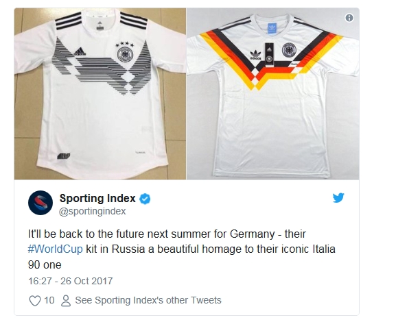 이번 독일의 유니폼은 1990년 이탈리아 월드컵 유니폼을 재해석 했다. 독일 국기인 삼색이 표현되지 않았지만 가슴과 어깨로 이어지는 라인의 무늬는 똑같다. 그리고 원정 유니폼도 잉글랜드와 준결승서 착용했던 유니폼을 재해석 했다.