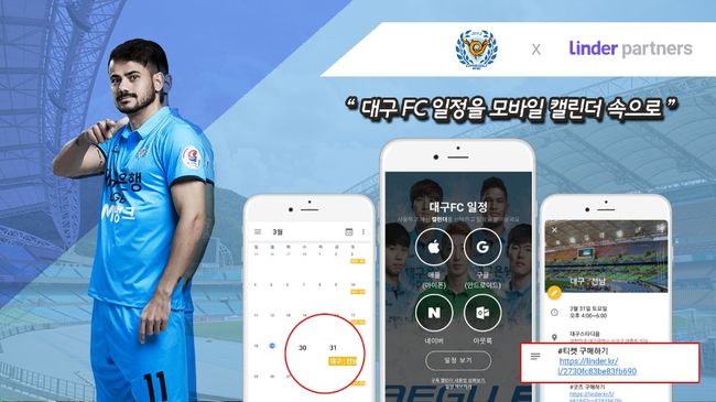 대구는 캘린더 마케팅 솔루션 스타트업 ‘린더(Linder)’와 제휴를 맺고 2018시즌 대구FC 경기 일정 캘린더 구독 서비스를 제공하기로 했다.