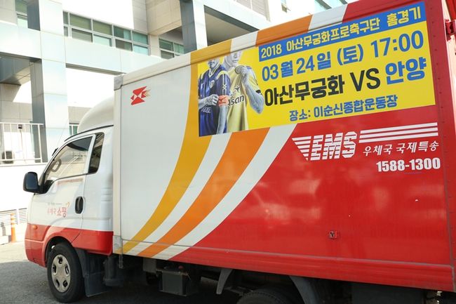 지난 1월 아산우체국과 양 기관의 상호발전을 위해 홍보활동, 사회공헌사업 및, 다양한 사업에 대한 상호 교류 협약을 맺었던 아산무궁화프로축구단은 오는 24일 FC안양과의 홈경기부터 택배 배송을 위해 관내 구석수석을 누비는 우체국 택배차량에 아산무궁화의 홈경기 일시가 첨부된 홍보 도안을 제작·부착해 다각도로 지역민들에게 널리 아산무궁화의 홈경기를 알릴 계획이다.